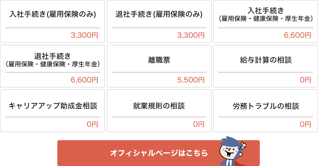 労働保険料の申告納付手続を申請代行します。健保組合などの場合は別途費用が必要です。該当する場合は担当よりご案内します。